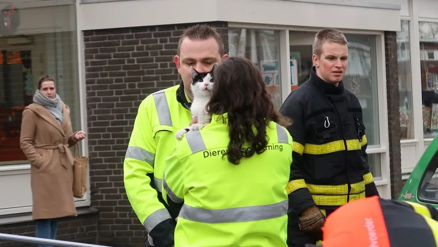 Een brandweerman zaagde de tak door terwijl mensen van de dierenambulance met een groot net de kat opvingen. De kat is er na dit avontuur vandoor gegaan.